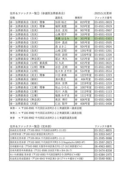 FAX表更新しました。緑が変更箇所。自民法務委員は毎日のように1、2人入れ替わりがあります。高橋氏はすぐ外れるのでは。自公参議院国対を追加しました。