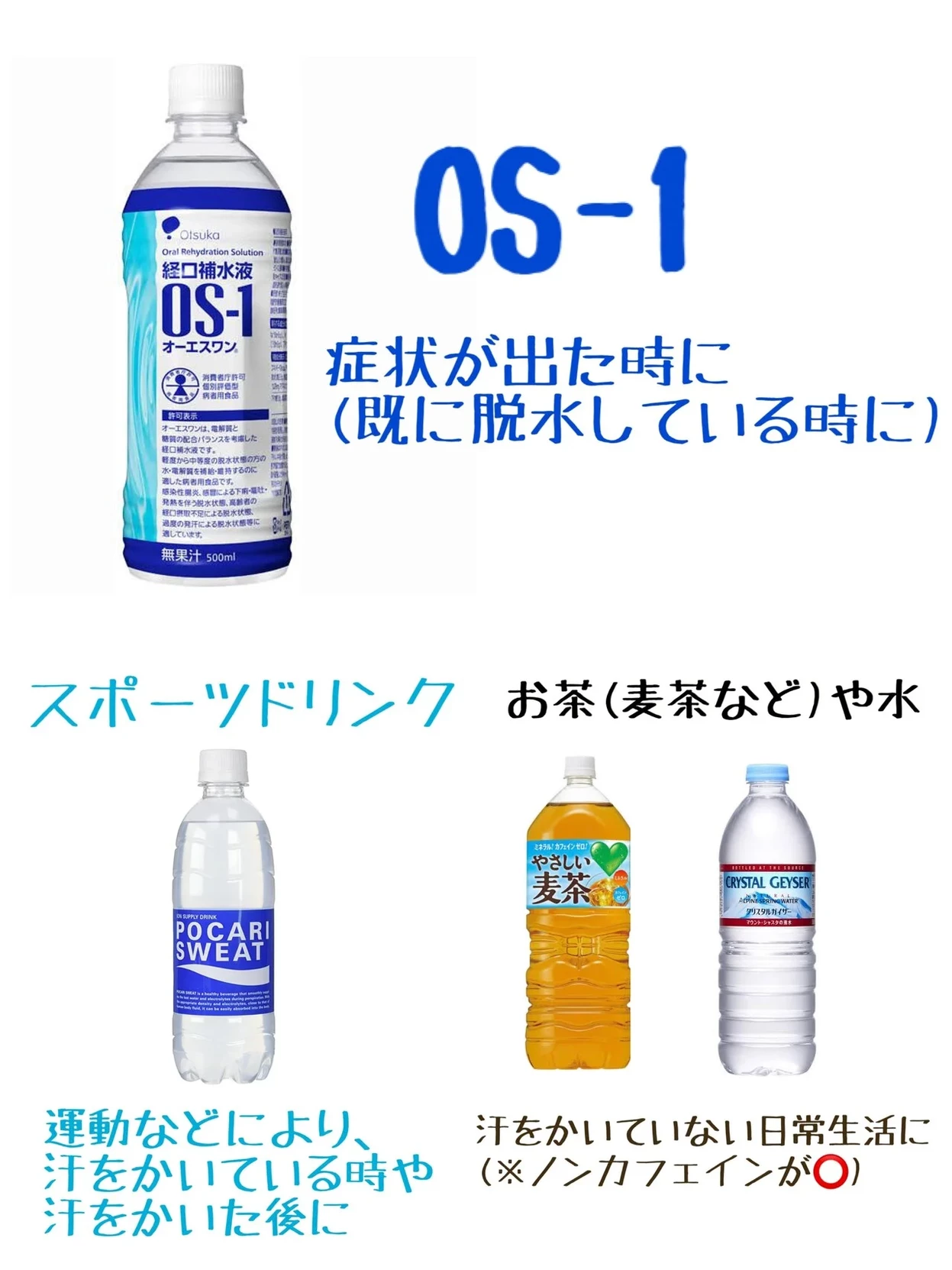 汗かいてないなら麦茶や水で十分。汗かいた時にスポーツドリンク。脱水が起こってOS-1だと。