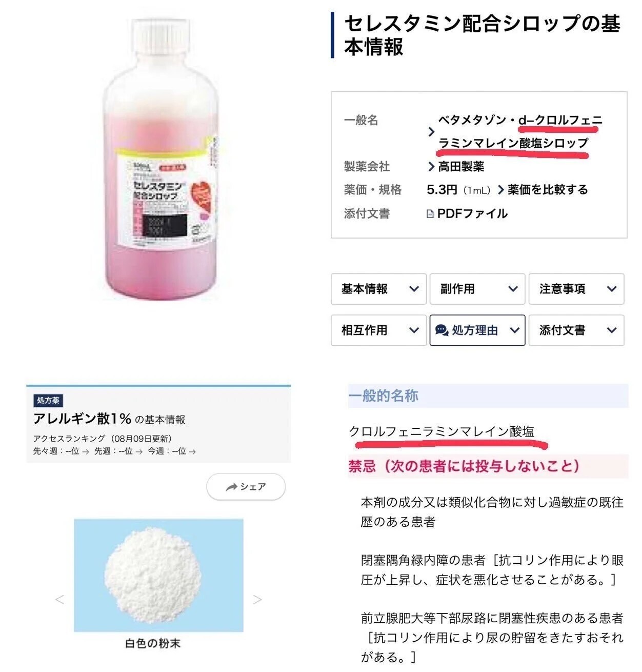 お薬手帳で、違う病院でセレスタミン配合シロップがすでに処方されており、現在も飲んでいるとの事。今回、風邪の鼻水にアレルギン散があったが、抗ヒスタミンが重複している。