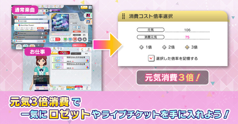 お仕事や通常楽曲をプレイする際に元気を最大3倍消費することで、一度に大量のロゼットやライブチケットを獲得できますよ!