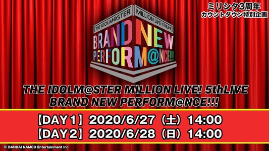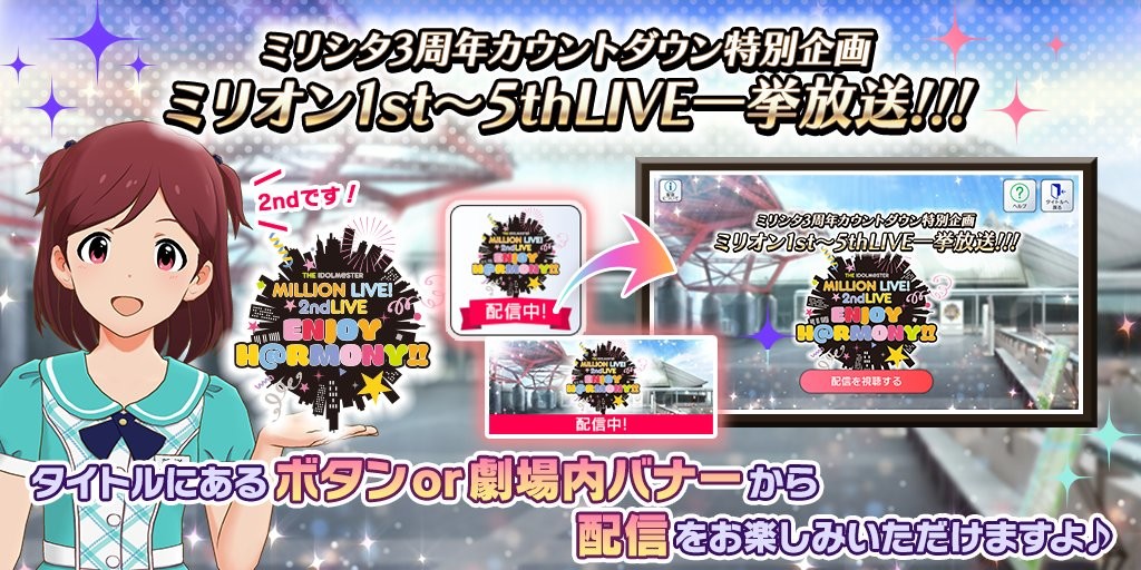 本日14:00より、ミリシタ3周年カウントダウン特別企画として「THE IDOLM@STER MILLION LIVE! 2ndLIVE ENJOY H@RMONY!! DAY1」のライブ映像をオンライン配信いたします