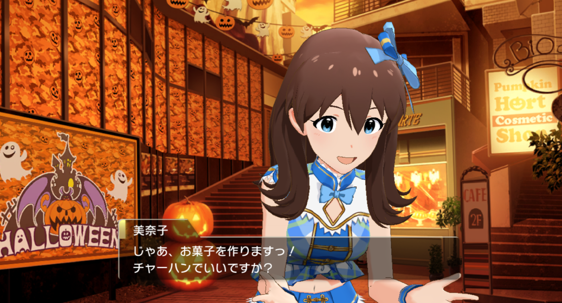 これがあの有名な、美奈子の「チャーハンはお菓子」発言ですか。ハロウィン美奈子のコミュだったのか#ミリシタ #ミリシタスクショ夜の1枚