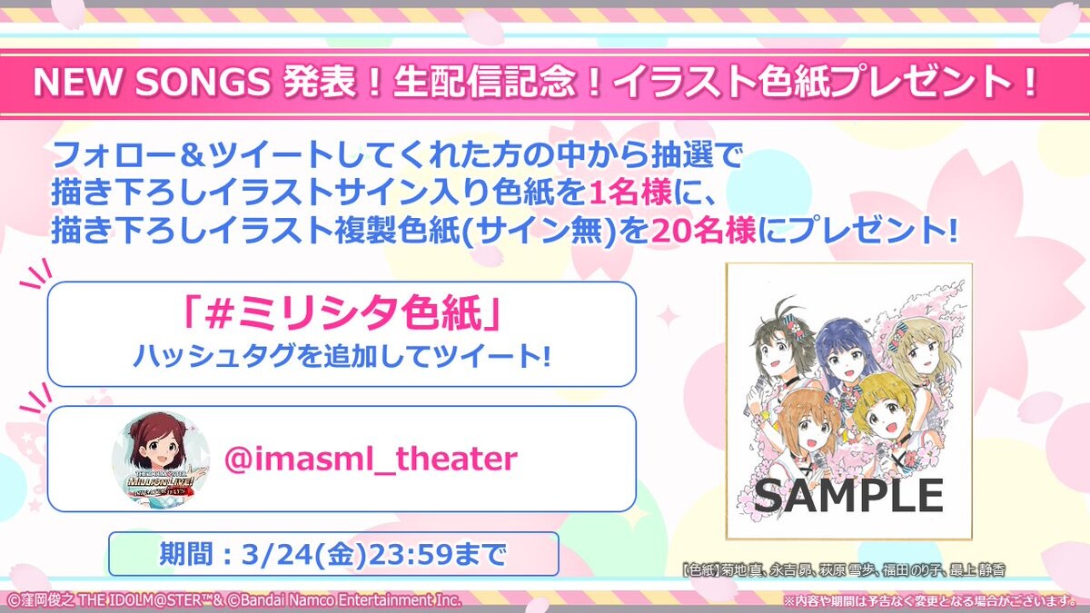 【ミリシタ】『ミリシタ “NEW SONGS” 発表!生配信』放送記念! サイン入り描き下ろしイラスト色紙プレゼントキャンペーン実施中! #ミリシタ色紙 #ミリシタ #ミリシタ生配信 #idolmaster https://idolmaster-official.jp/news/01_8074