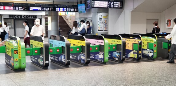 #横浜 駅中央南改札の自動改札機に、 #モバイルSuica の広告とともに鉄道150周年のステッカーも貼ってあり、あさかぜ・さくら・富士ぶさといった寝台列車に混じって横浜線103系珍ドコ編成の写真が貼ってあってワロタ