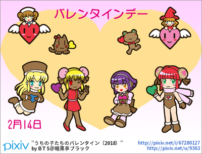 うちの子たちのバレンタイン(2018) | BTS@暗黒亭ブラック #pixiv #バレンタイン #看板娘 #カエル #ネコ #リトルナース #トレミー https://www.pixiv.net/member_illust.php?mode=medium&illust_id=67280127お菓子屋の陰謀2018を投稿しました♪