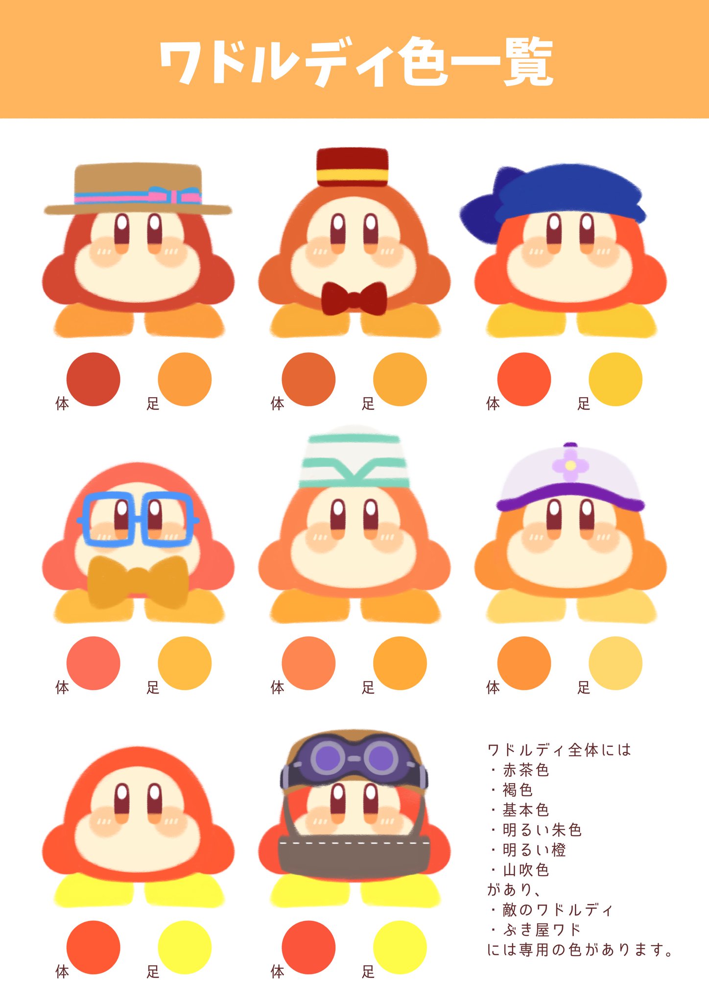 RT @grkkdrm2: 以前も投稿したのですが、何と足の色もワドルディによって変わっていたり、特殊なわにゃがいたりしたので再びまとめ直しました!ワドルディの色一覧です!!!