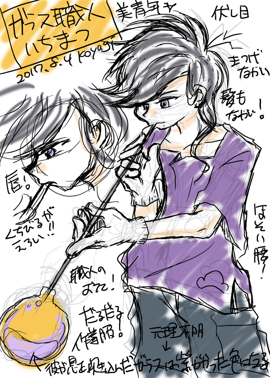 息抜きで描いた妄想らくがき。「ガラス職人いちまつ」唇がえろい職人たまんねえ!字ィめっちゃ汚いw原理不明で息を吹き込んだガラスが紫がかるとかだいぶ疲れてるねあたし!ぼさぼさ頭でだるだるの薄汚れた作業服に身を包んだ美青年に萌えるとかどうした私!誰かこういうのお好きな方いないのぉ!? #一松 #BL松 #pixivSketch http://sketch.pixiv.net/items/3613047877746076705 https://pawoo.net/media/FYzw_fuVdmUwT0RX7IM