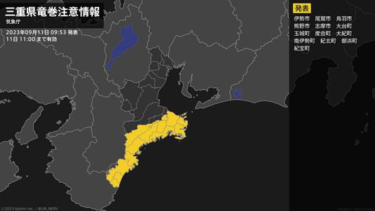 【三重県 竜巻注意情報】三重県は、竜巻などの激しい突風が発生しやすい気象状況になっています。頑丈な建物内に移動するなど安全確保に努めてください。この情報は11日11:00まで有効です。#竜巻注意情報 #三重県