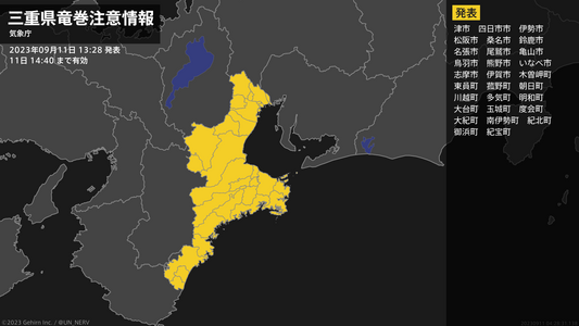 【三重県 竜巻注意情報】三重県は、竜巻などの激しい突風が発生しやすい気象状況になっています。頑丈な建物内に移動するなど安全確保に努めてください。この情報は11日13:40まで有効です。#竜巻注意情報 #三重県