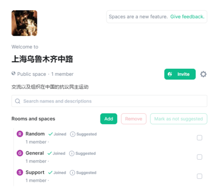 我在matrix.org建立了一个目的在交流现在各个地方抗议运动信息和组织的群组: