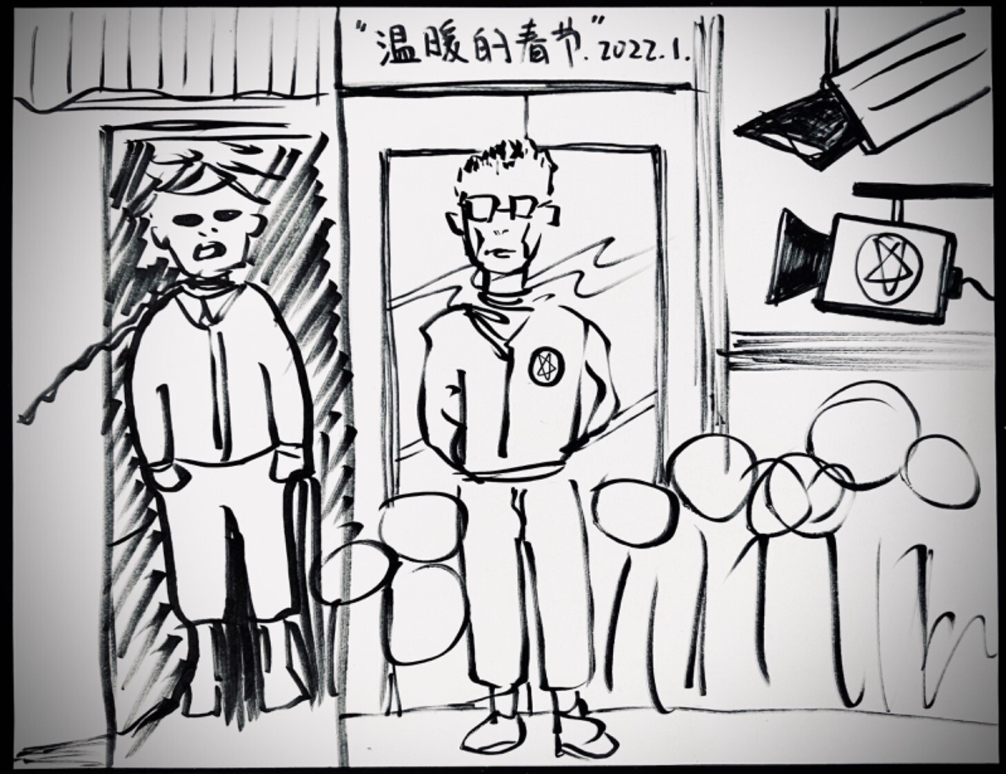 This is how I remembered the lunar new year of 2022. 之前看到广为流传的几幅插画,虽然理解创作者对事件的讽刺,但心里还是不舒服。所以我很犹豫要不要也画点什么作为记录,毕竟除了挥挥笔杆子,我不知道还能做些什么。最终还是信笔由缰,用尽一支黑笔的最后一点墨水,速涂了这张鬼画符一样的东西。