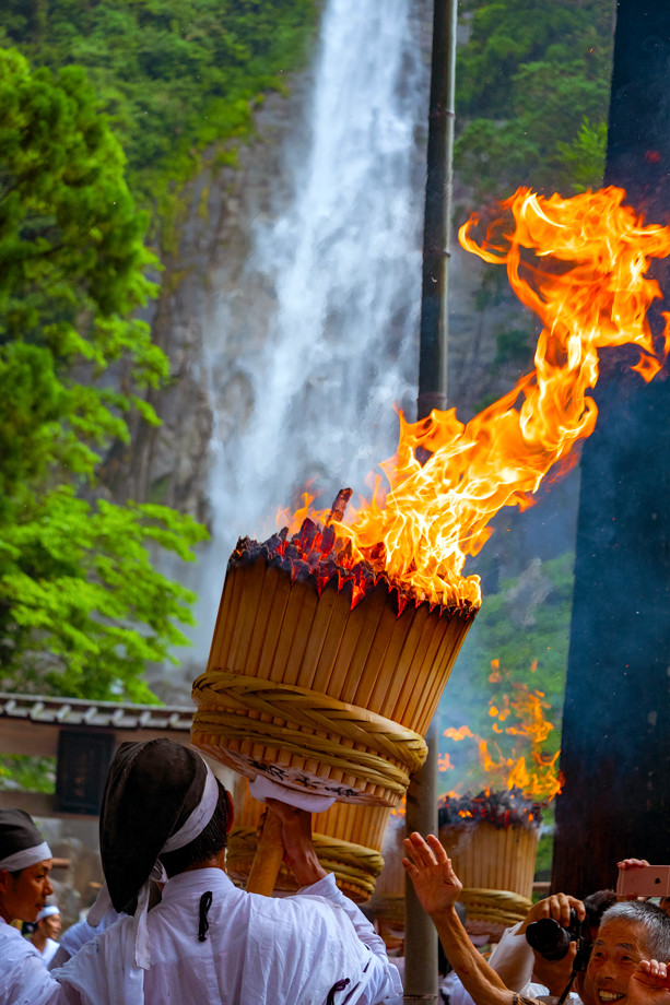 十二体の熊野の神々を、御滝の姿を表した高さ6mの十二体の扇神輿に移し、御本社より御滝へ渡御をなし、御滝の参道にて重さ50㎏~60㎏の十二本の大松明でお迎えし、その炎で清める神事が「那智の扇祭り」です。
