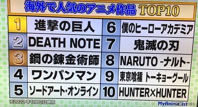 ハルハル@アニメ依存系女子@さんはTwitterを使っています: 「今海外で人気のアニメTOP10はこんな感じらしい #世界一受けたい授業 https://t.co/nf5avtNT8b」 / Twitter https://twitter.com/haruharu_aniaka/status/1593912657966350336