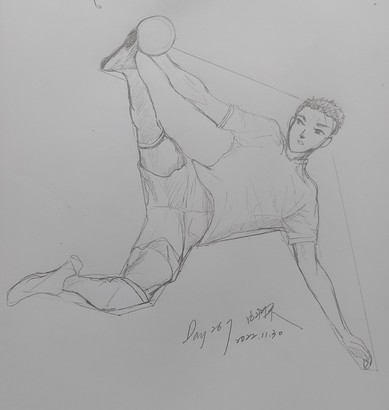這一球,在高強度的比賽還能使出厲害的足球技巧倒掛金鉤,真的很帥!忍不住來練習畫這姿勢,變形鞋子反而覺得最難、臉的表情。