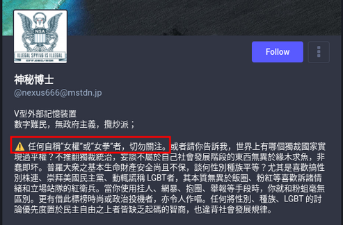 原因:曾发表仇女、恐LGBT言论,被多个实例封禁后继续新开帐号持续骚扰。
