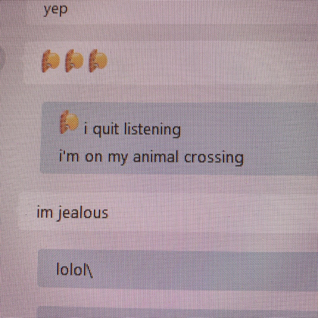 回来的时候发现还在搞,Zach发来一个崩溃表情,我回了个崩溃表情并告诉他我没在听了甚至还在玩动森
