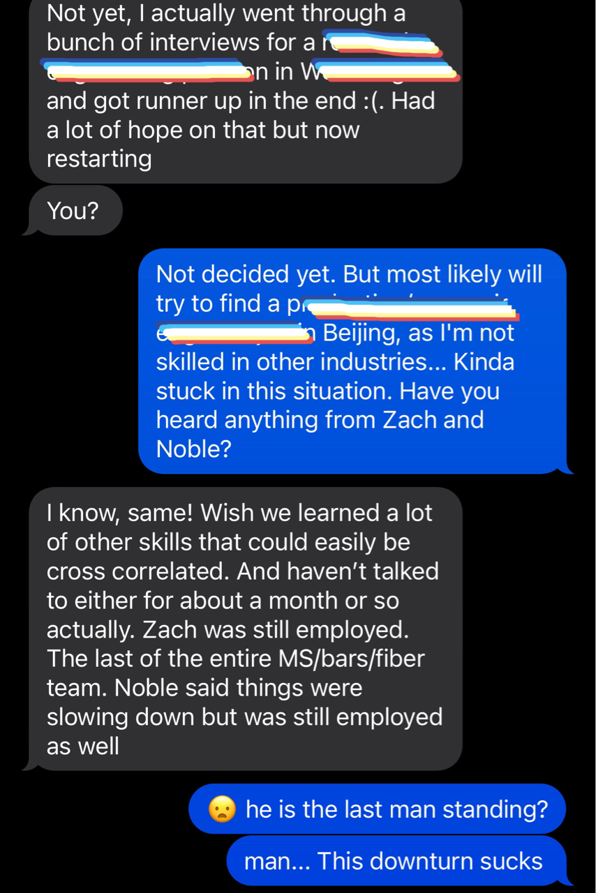 #今日份的办公室topic 时隔好几个月的更新,和Noah小哥聊天,并不快乐也不温馨,但至少觉得认识一场不容易珍惜这段缘x 两边互相通报了近况,他和他媳妇儿自从被裁了以后还没有重新找到工作,noble和zach倒是安好但也就只剩他俩了,我们原来那个18人大组现在只剩俩了:0400:
