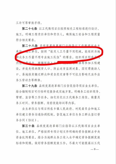 经济差到很多人失业已经需要赈灾的地步了,共产党却在搞以工代赈:不用机械,多用人工,要彻底贯彻驭民五术疲民、劳民避免他们造反。