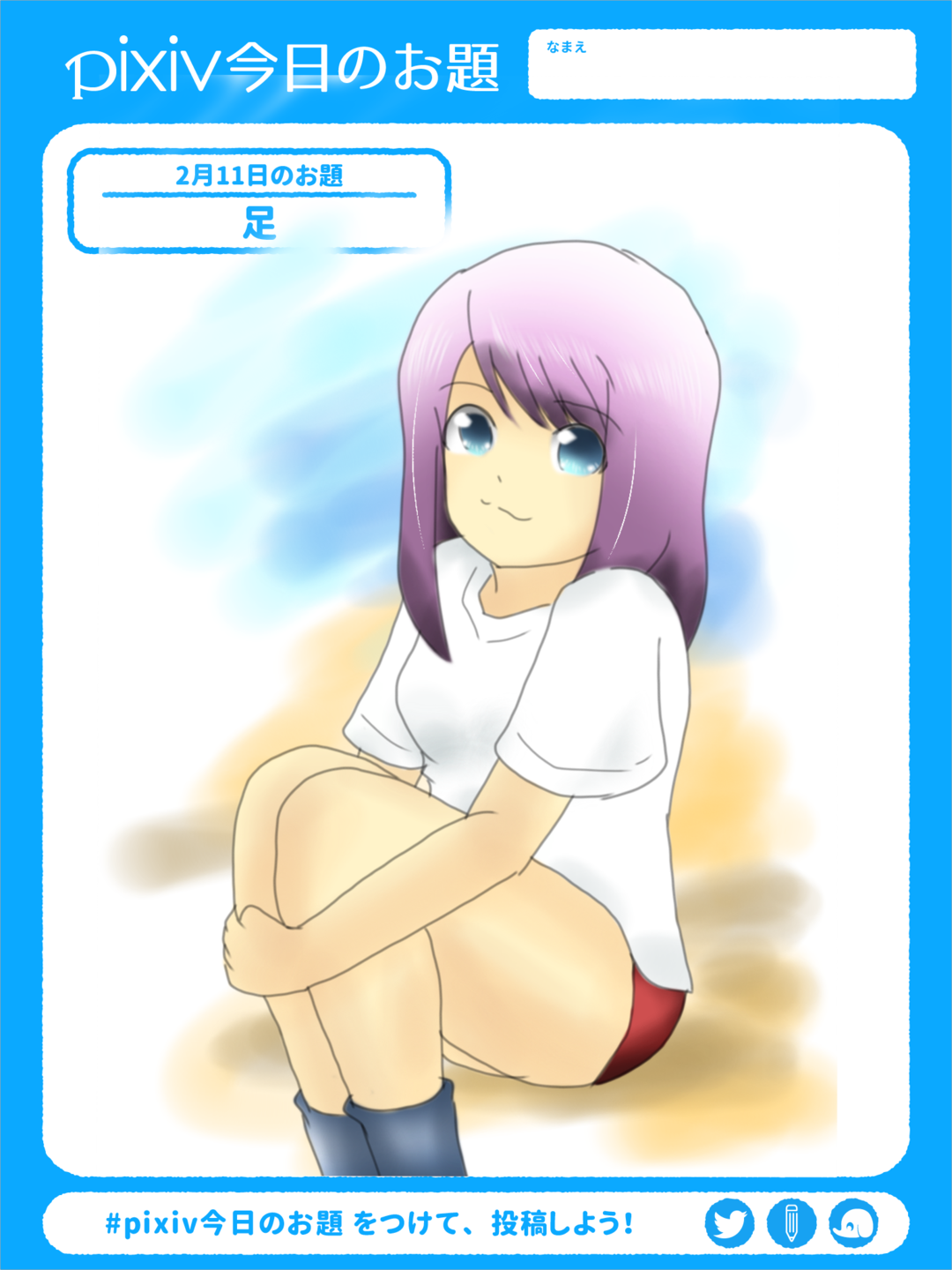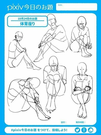 今日のお題は「 #体育座り 」です。お尻をペタンと地面につけて、両脚のヒザを立てて座る体育座りを描いてみよう!