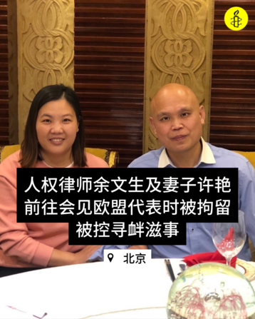 4月13日,余文生与许艳在在前往会见欧盟驻华代表团的路上被警察带走,随后被控以“寻衅滋事罪“,目前尚未清楚二人是否能够与自己选择的律师联系。#余文生 因709案, 在2018年被当局控以“煽动颠覆国家政权罪”,2022年3月方刑满释放。