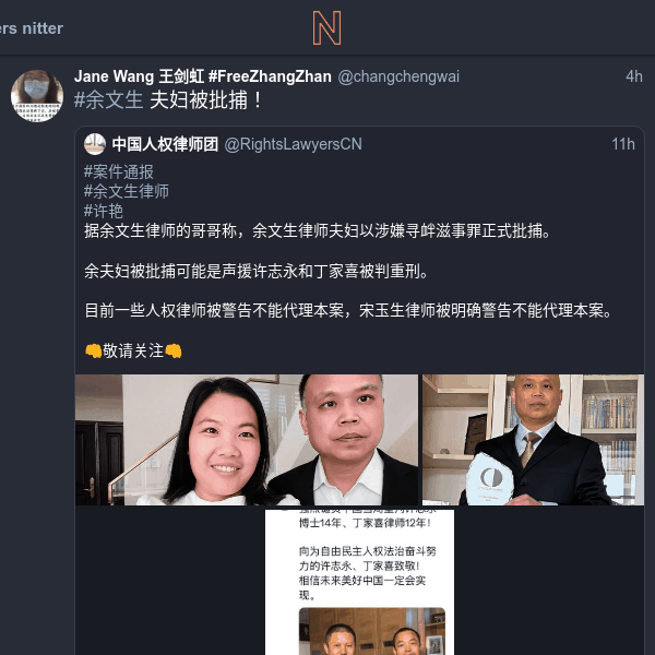 @changchengwai RT by @badiucao: #余文生 夫妇被批捕! https://nitter.hongkongers.net/changchengwai/status/1660378640440340481#m
