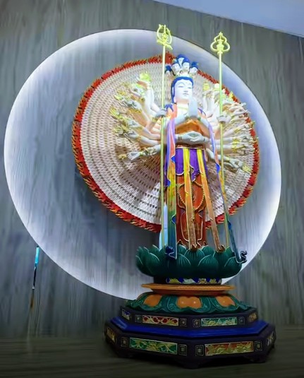 4、拿起右側的勺子裝水,淋上右邊的小釋迦佛尊、在拿起左邊的勺子裝水_淋上左邊肩膀,最後用一勺從脖子往背面淋下去。