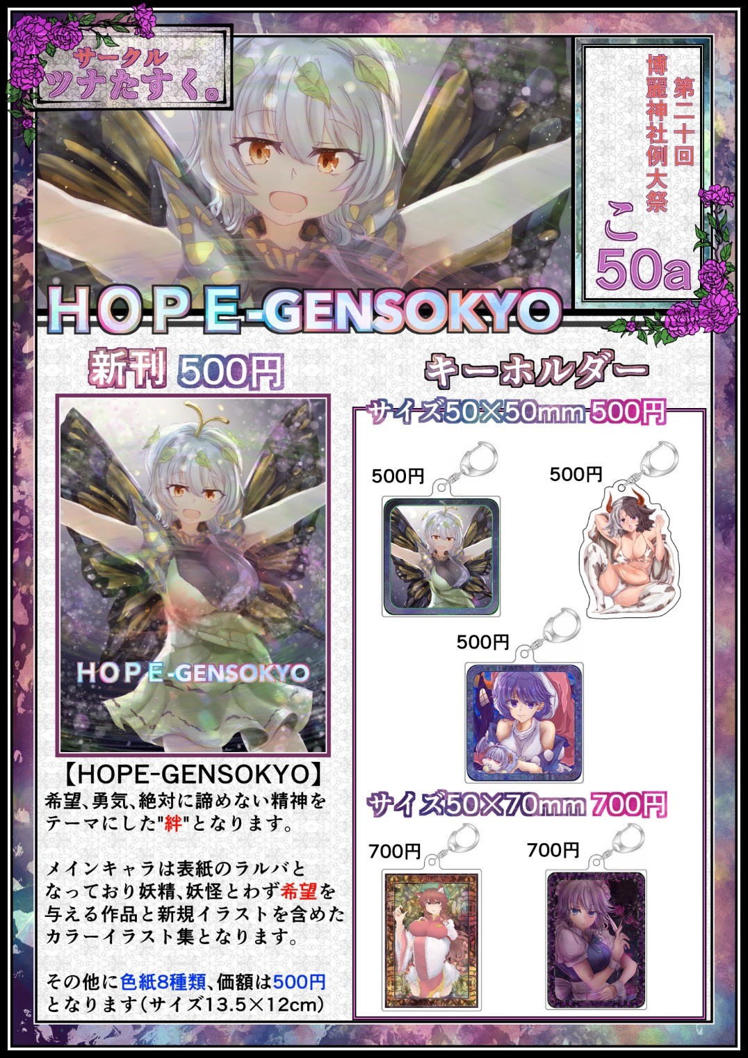 配置場所は『こ50a』を頂きました。配布物は新刊全カラーページイラスト集とキーホルダー3種類(サイズ50×50mm)とサイズが異なるキーホルダー2種類(サイズ50×70mm)となります。