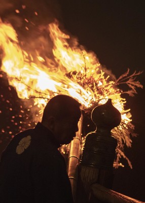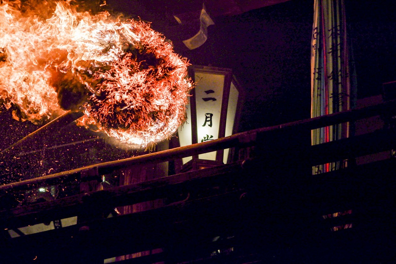 前の童子のお尻に次のお松明の火が着きそうなことから、この日のお松明を『尻つけ松明』と呼ぶ。
