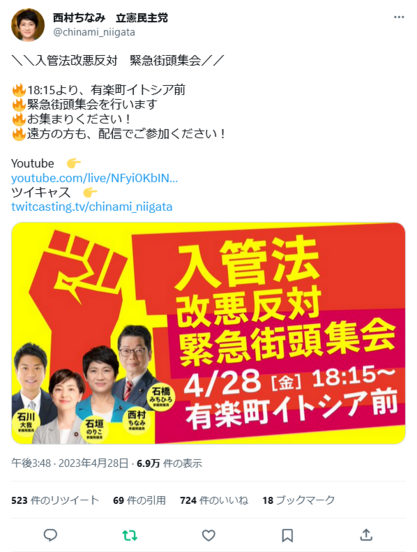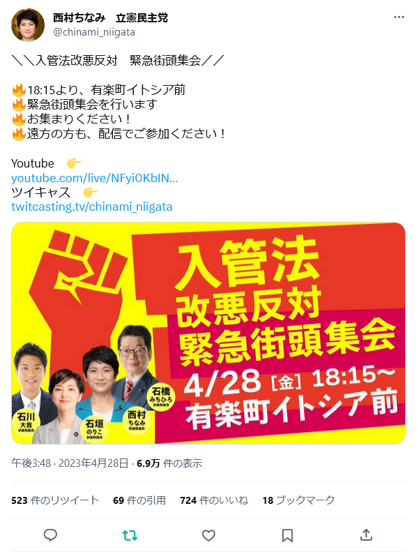 『入管法改悪反対 緊急街頭集会』(4月28日@有楽町/衆院法務委員会可決後に立憲民主党が開催)の動画が公開されていましたので、各スピーチを文字起こししてみました。
