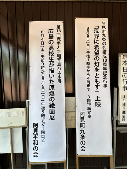 茨城県阿見町の中央公民館に寄ったところ、たまたまこのような地域の催しをやっていて少し覗くことができた。ここで広島の基町高校の創造表現コースの生徒さんたちの広島原爆の絵を十数点見た。原版ではなく大判のプリントだったが、圧巻だった。この高校のコースでは以前から、広島の被爆者らの体験を受け継ぐ活動として、生徒さんが高齢の被爆者たちから直接話を聞き、繰り返し聞き、それを生徒たちの手で絵画にしていく活動をしていることを知った。全ての絵がすごい。三輪トラックの荷台に載せられた瀕死の人々の身体がどのような姿勢になるのか、また、比治山から大火傷をした人たちが杖をつきながら下山してくる時どのような姿勢なのか、生徒間で下書きを試み、被爆者本人に見てもらい、一つ一つそのようにして確認して描かれている。たいへん失礼ながら複写版での鑑賞だったが、完全に圧倒さられた。表現するとはこういうことなんだ。
