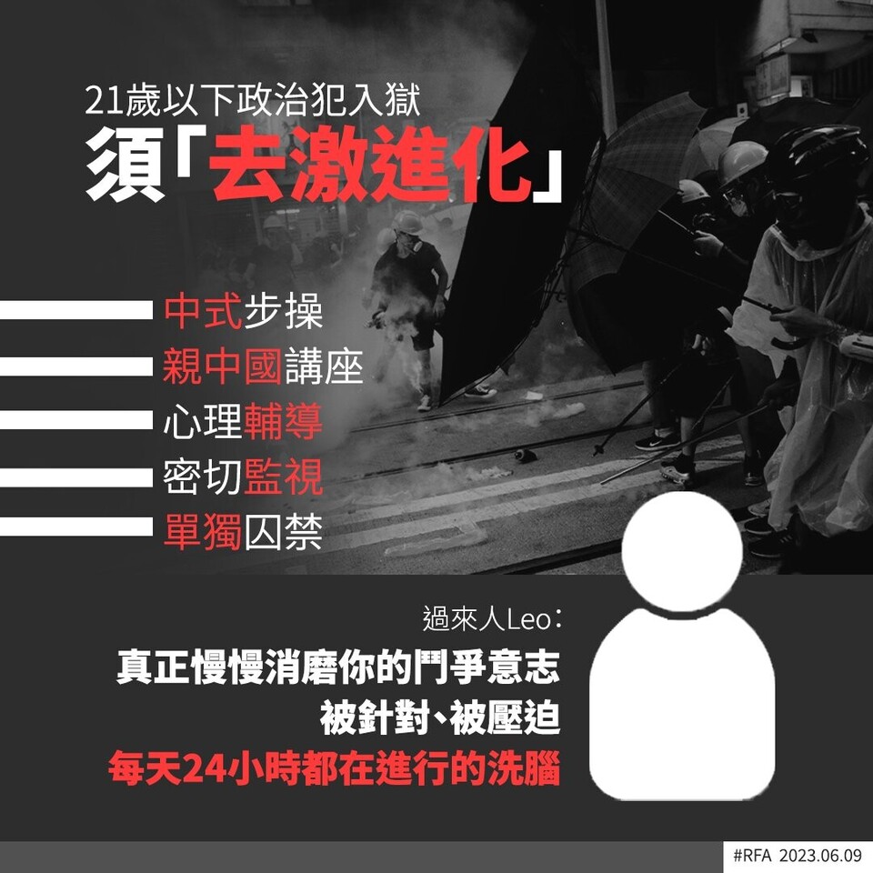 @RfaCantonese RT by @cowcfj: 今天是香港「#反送中」運動4週年,美國《華盛頓郵報》在這時刻,發佈有關青少年政治犯的專題報道,指這些青少年犯都要在監獄接受一項「#去激進化」計劃,當局的目標是要遏制他們的政治理想。有曾參與計劃的人直言,「這就是每天24小時都在進行洗腦」。 詳細報道 ➡️ https://rb.gy/j9ln5 https://nitter.hongkongers.net/RfaCantonese/status/1667045792987725826#m