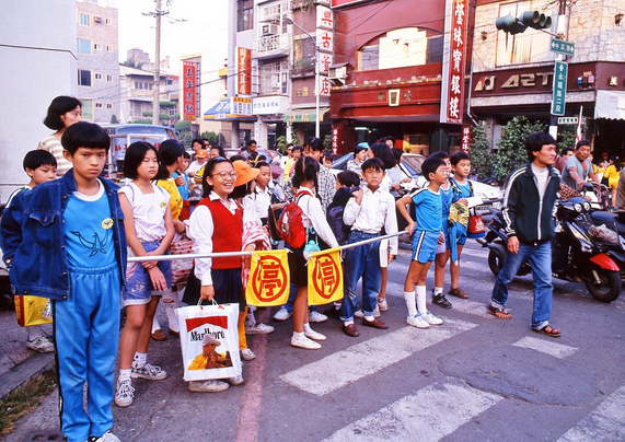 Children waiting at a crossing, corner of Yongfu Road Section 2 and Zhongzheng Road, Tainan, 1993.
