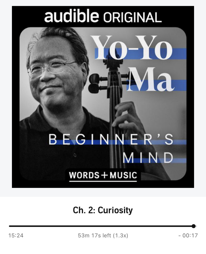 在Audible上听马友友的小书 <Beginner’s Mind>,发现书的形式早已超越了文字这一种表达方式,用声音作为载体去对话更优,人与乐器同为作者。书名叫这个是因为每一次演出他都试图当成初次演奏那样去发现作品中的新奇。很是羡慕。听觉盛宴。