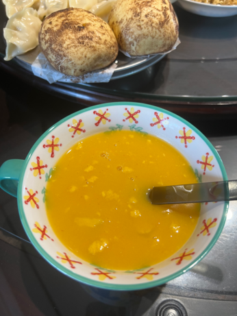 南瓜米米粥粥,喝起来糊糊香香的。一碗下肚,肚子很快乐。颜色像喝了一杯流质太阳,我很喜欢。