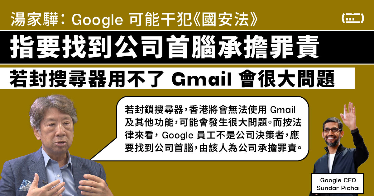湯家驊:Google 可能干犯《國安法》指要找到公司首腦承擔罪責 若封搜尋器用不了 Gmail 會很大問題