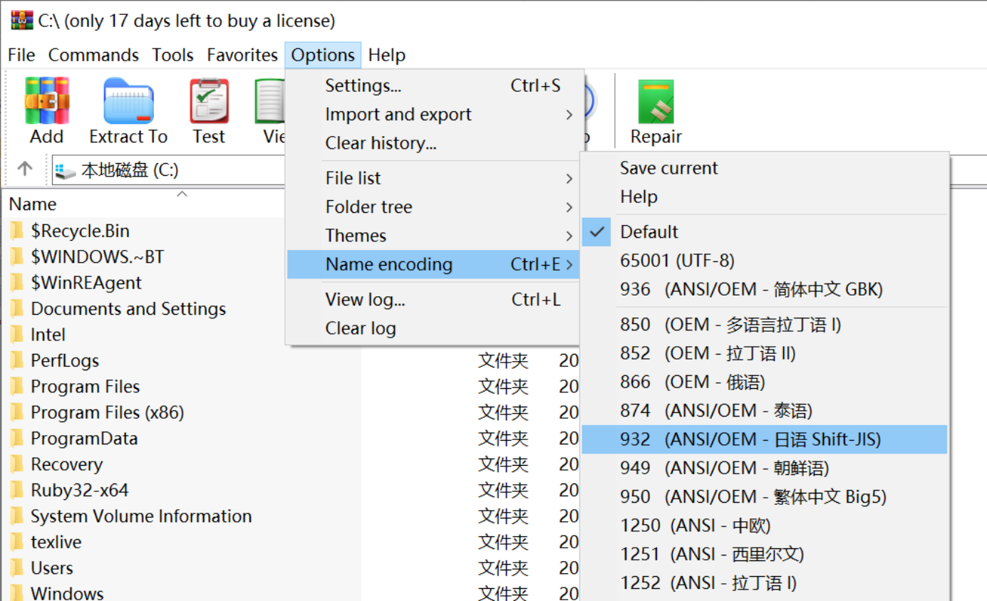 Options > Name encoding > 932 (ANSI/OEM - 日语 Shift-JIS)