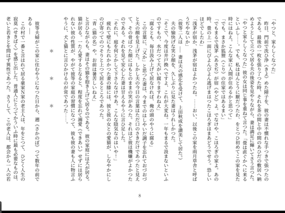 この小説の中で言及されている雨月物語についても同じように整形して読んでみたいところなのだが,#青空文庫 ではもうちょっとで公開しそうなところで止まっているので,もう少し待ってみるしかない.#多言語 というラベルをつけてみているが,この場合の,江戸時代初期の日本語は,僕にとってオランダ語やスペイン語と同じくらいの距離のある言語なので実際に他言語である.