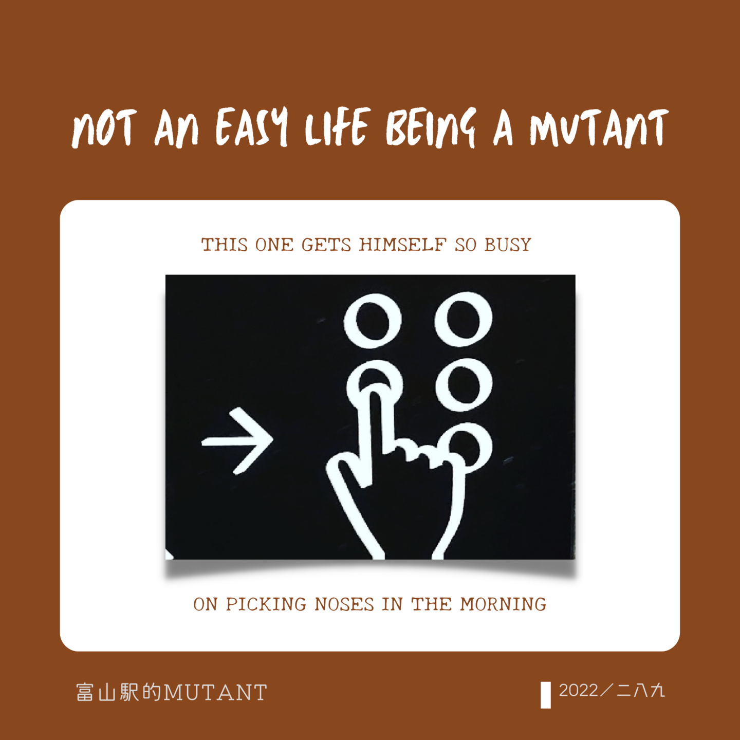 Not an easy life being a mutant. This one gets himself so busy on picking noses in the morning.