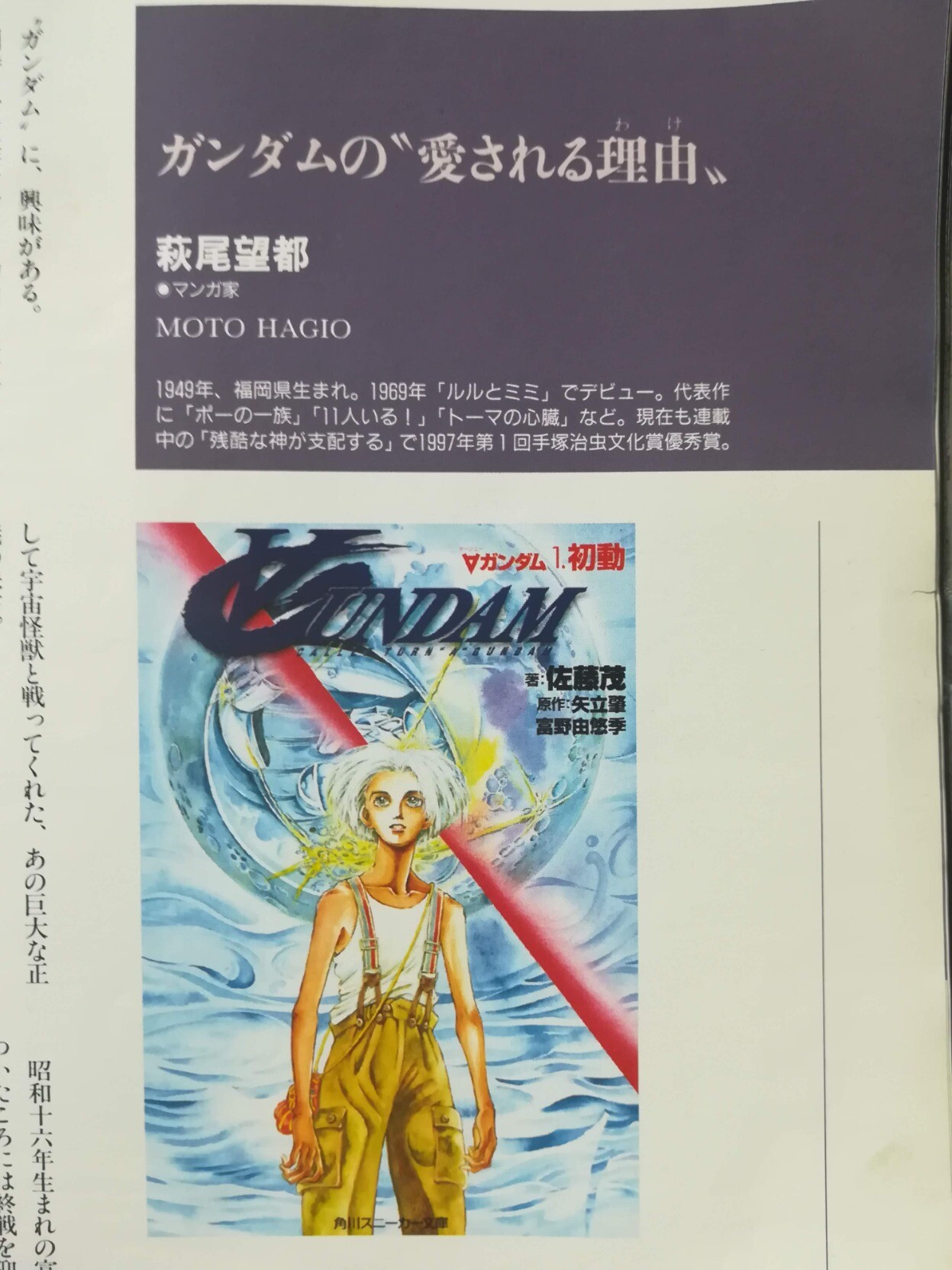 同時に、原作者であり動画の監督でもある富野由悠季という人の、戦争観、人間へのこだわりにも興味がある。“機動戦士ガンダム"というタイトルで二十年前に始まったこのロボット・アニメーションは、マニアックとも言えるファンの熱気に支えられ、"ガンダム”というキーワードをもとに、主人公、時代設定を変えて、多岐にその世界を広げていった。