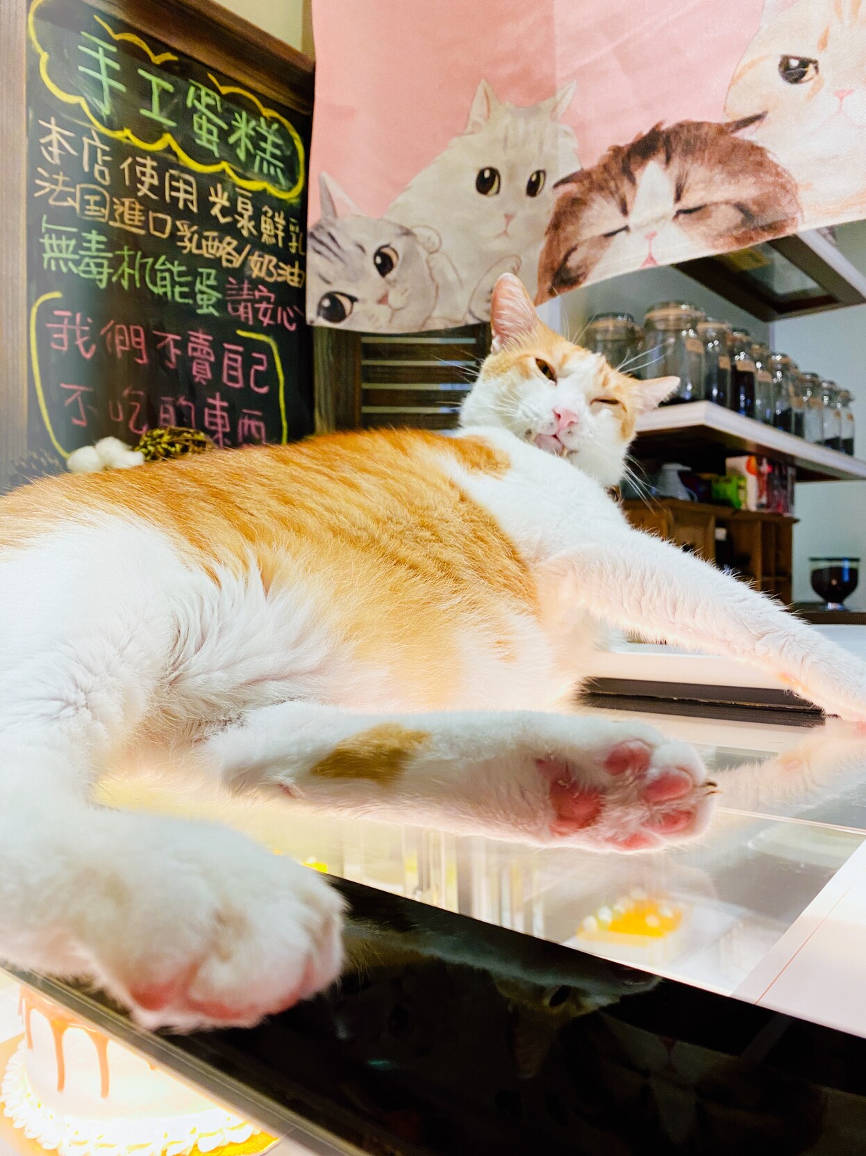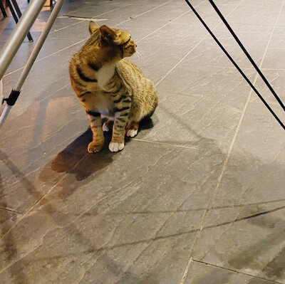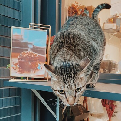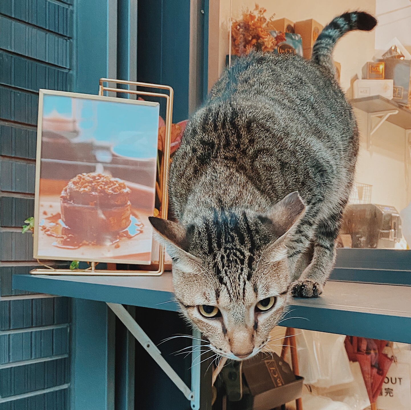 #小米遇到貓 去拿迷你肉桂捲,工作室在轉角,一個轉彎就看到貓貓的迎接,不是店家的貓,但跑到人家平台上