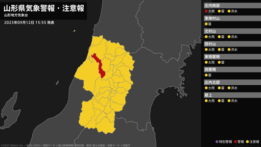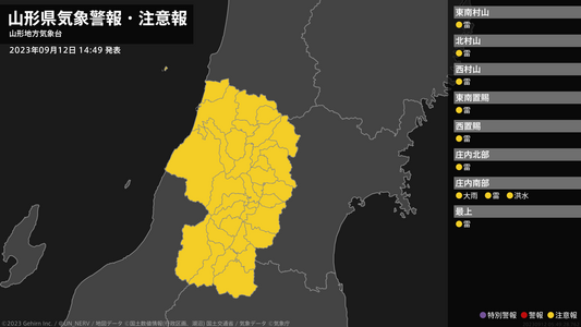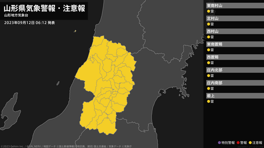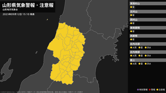 【山形県 気象警報・注意報 2023年09月12日 15:10】庄内、最上では、土砂災害や河川の増水に注意してください。庄内では、低い土地の浸水に注意してください。山形県では、竜巻などの激しい突風や落雷に注意してください。#気象警報注意報 #山形県