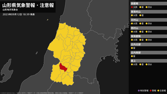 【山形県 気象警報・注意報 2023年09月12日 18:39】置賜では、12日夜遅くまで低い土地の浸水に警戒してください。#気象警報注意報 #山形県