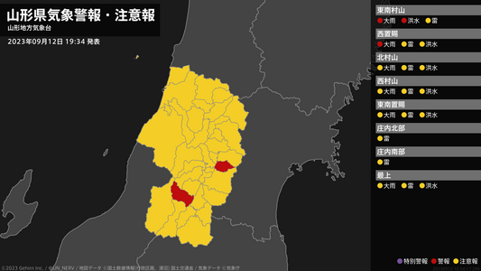 【山形県 気象警報・注意報 2023年09月12日 19:34】村山、置賜では、12日夜遅くまで低い土地の浸水に警戒してください。村山では、12日夜遅くまで河川の増水に警戒してください。#気象警報注意報 #山形県