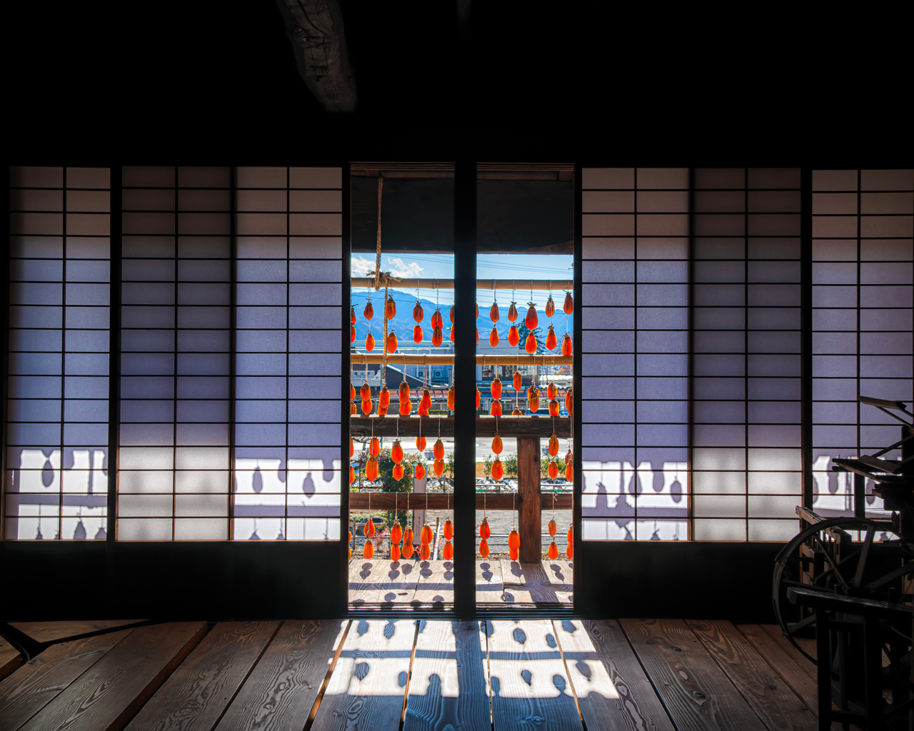 普通の渋柿なら物干しハンガーのピンチで挟んで干すと手早いんですが、蜂屋柿は重すぎでピンチから落ちるので、紐で吊るして干してます。