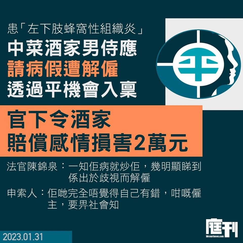 中菜酒家男侍應入職不久,在試用期間被診斷患「左下肢蜂窩性組織炎」,獲發4天病假,他即將復工時,獲公司告知已被解僱,原因是擔心他會病發,男侍應早前透過 #平機會 入稟區域法院,指公司將他辭退是對他作出直接殘疾歧視,要求公司就其感情損害賠償6萬元。法官陳錦泉表示,公司見申索人患病而將他辭退,「幾明顯睇到係出於歧視而解僱」,考慮公司不曾在言語等方面侮辱申索人,而案發時申索人只工作了數天、仍處於試用期,歧視情節較案例輕微,惟必須讓公眾知悉,此等行為社會並不能接受,亦會有法律後果,下令公司作出2萬元賠償,另須支付訟費。