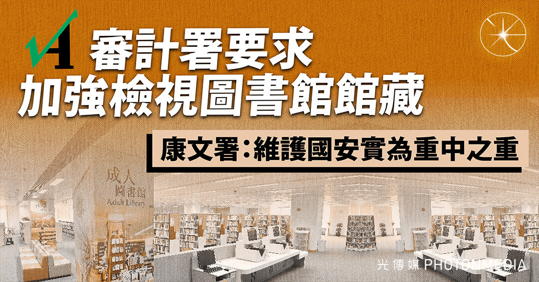審計署今日發表的審計報告,審核多個政府部門、機構的國安成效,包括提出公共圖書館需要加強檢視圖書館資料以維護國家安全。康文署回覆指,為維護國家安全,揀選圖書館資料需要更多時間,而可供採購的合適書目亦減少…