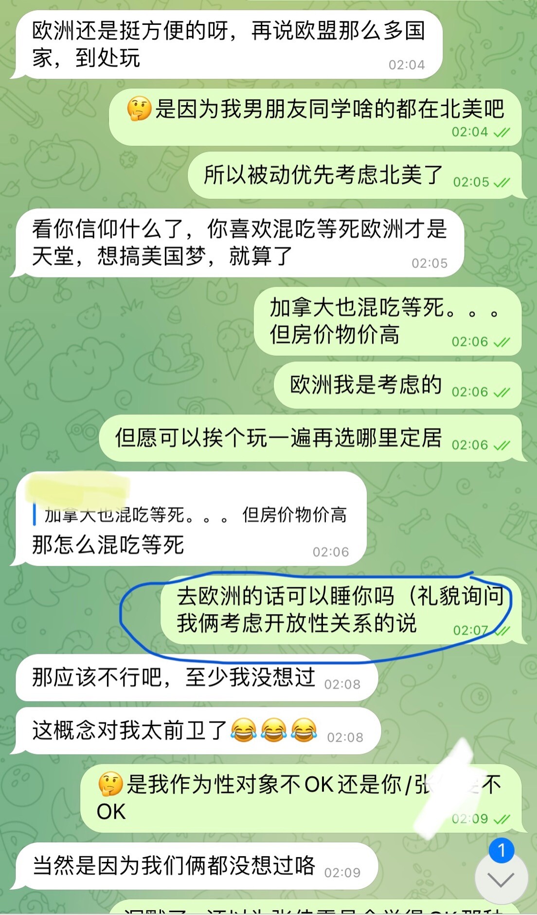 看完聊天记录,看到我没怎么调情,对方有保证,还夸他可爱,他对对方的敌意也降低了一丢丢。但还是很被害妄想地觉得,“男德PhD”“保证不睡有男朋友的”“开放性关系的学姐和男朋友”都是对方编出来定向狙我的(……)