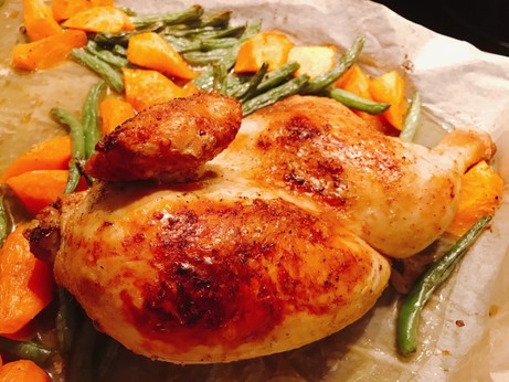#我家的家常菜 又做了一次花椒烤鸡,这次放了胡萝卜和豆角一起来吸鸡汁,除了鸡胸肉其他都很入味,鸡胸肉就蘸家里常备的酱油泡辣椒😊下周开始要全面进入补铁阶段,鸡肉都会少买,牛肉、猪肉、羊肉和内脏会是主角。