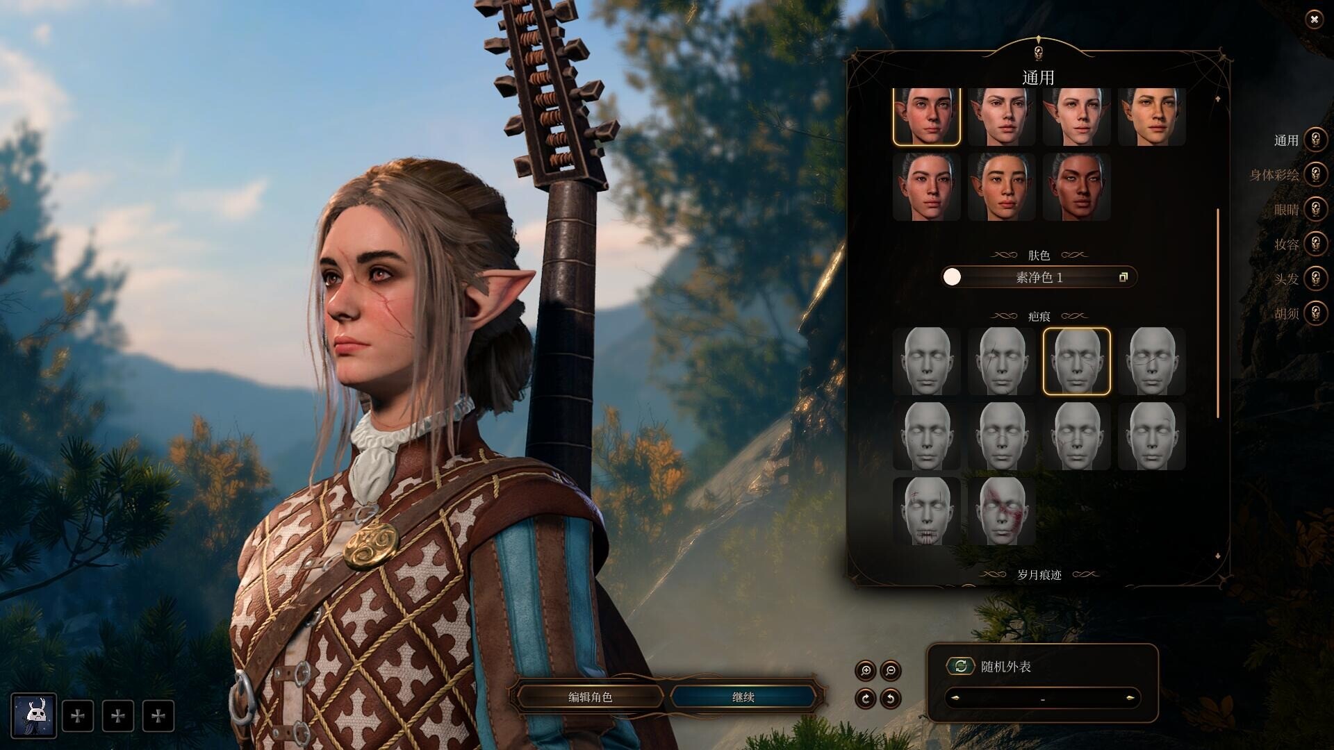 想来想去就自己捏了一个:女半精灵+吟游诗人+骗子,捏脸的时候,脑海里浮现的是巫师3里面的希瑞菈⋯⋯加上博德之门世界观应该不太和平吧?所以脸上加了点疤痕。