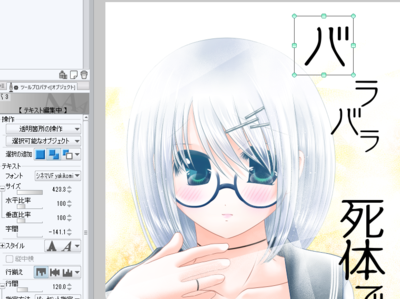 今日は真面目に2冊目の表紙着彩…前にポスター用の原稿やっておこうっと('ω')と思って、やってたんですけど、印刷屋さんのテンプレートに合わせて作成…してたらくりっぷすたじおって、フォントサイズが、423.3までしか大きくできなく?(;;゚Д゚)無制限だと思ってた…。